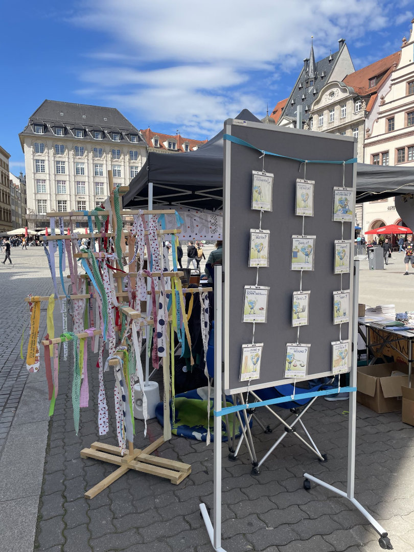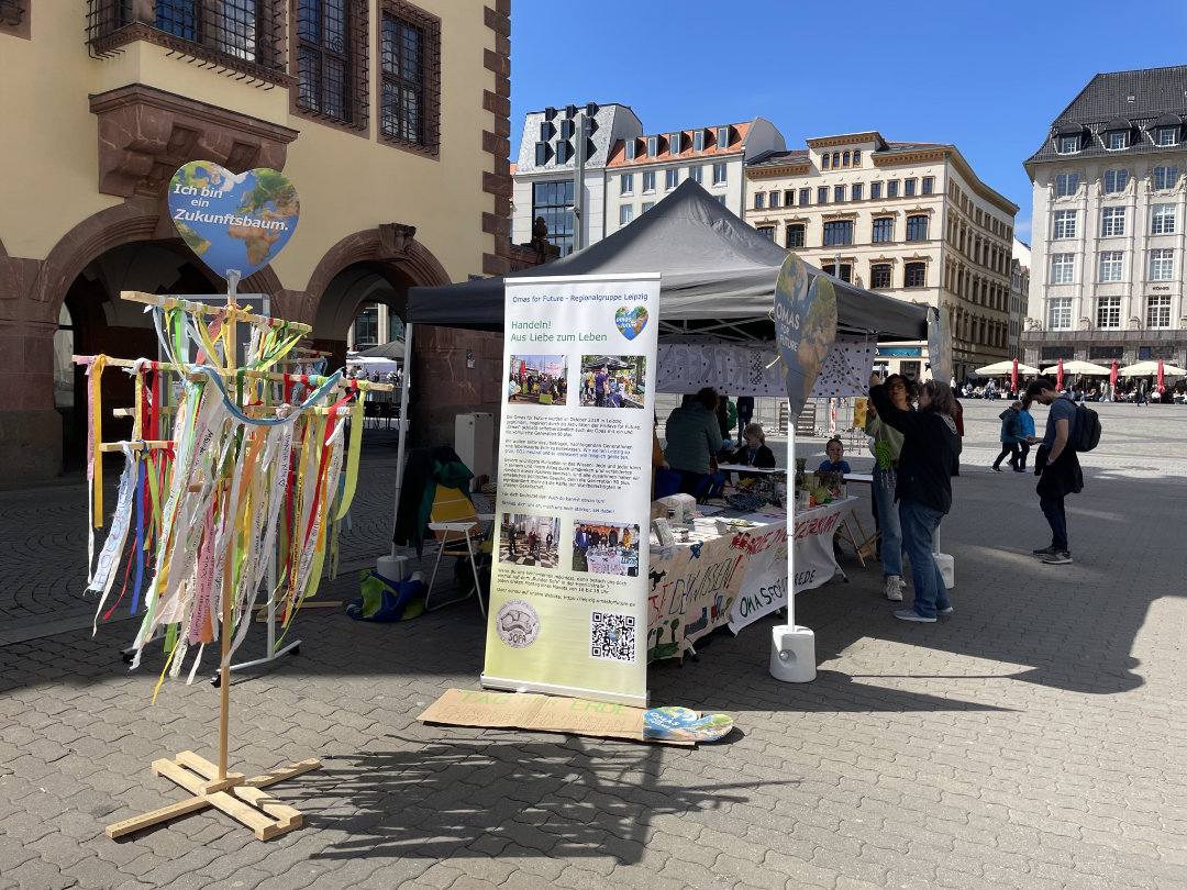 Die Leipziger Regionalgruppe der Omas for Future war mit einem Stand im Salzgässchen direkt in der Innenstadt präsent. Dort ging es nicht nur um einen positiv-motivierenden Blick in die Zukunft und um Selbstwirksamkeit, sondern dieses Jahr besonders um unsere Kinder und Enkel. Sie konnten ihre Wünsche für eine klimafreundliche Zukunft aufmalen, ihr Wissen beim Kinderquiz testen und Upcycling-Spiele ausprobieren.