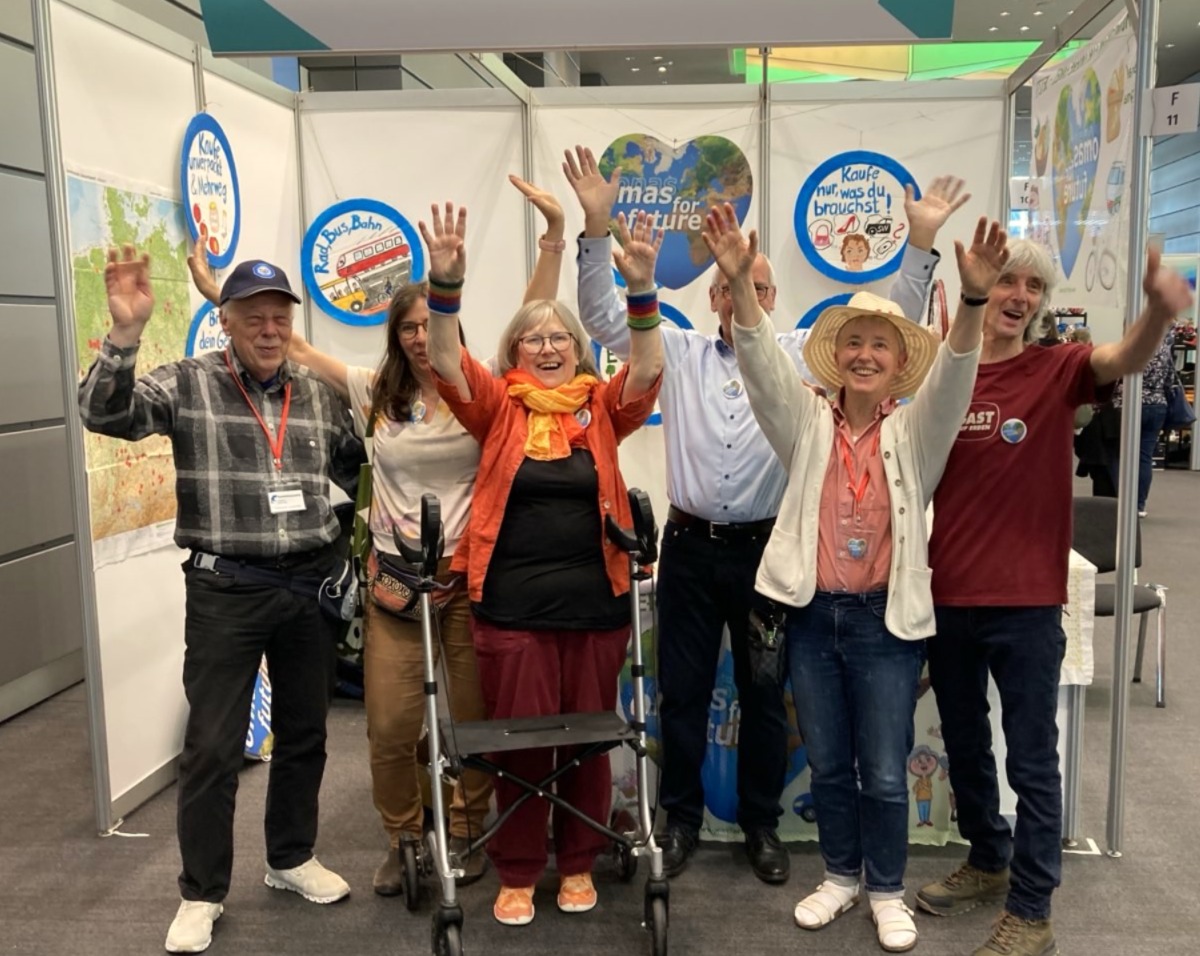 Letztendlich ergaben sich an den drei Tagen sehr erfreuliche Kontakte zu anderen Ständen. Sogar mit, dem von uns gegenüber liegendem Stand, der CDU hatten wir gute Kontakte, auch wenn die beiden Herren etwas irritiert waren, als wir mit unseren Klimabändern für Herrn Merz ankamen… Die beiden Betreuerinnen des Standes der Stadt Mannheim sangen dafür mit uns zusammen das Geburtstagsständchen für Carmen – und das mitten auf der Messe! Und so war es alles in allem eine rundherum bereichernde Veranstaltung für uns alle! Gerne wieder!!!!!