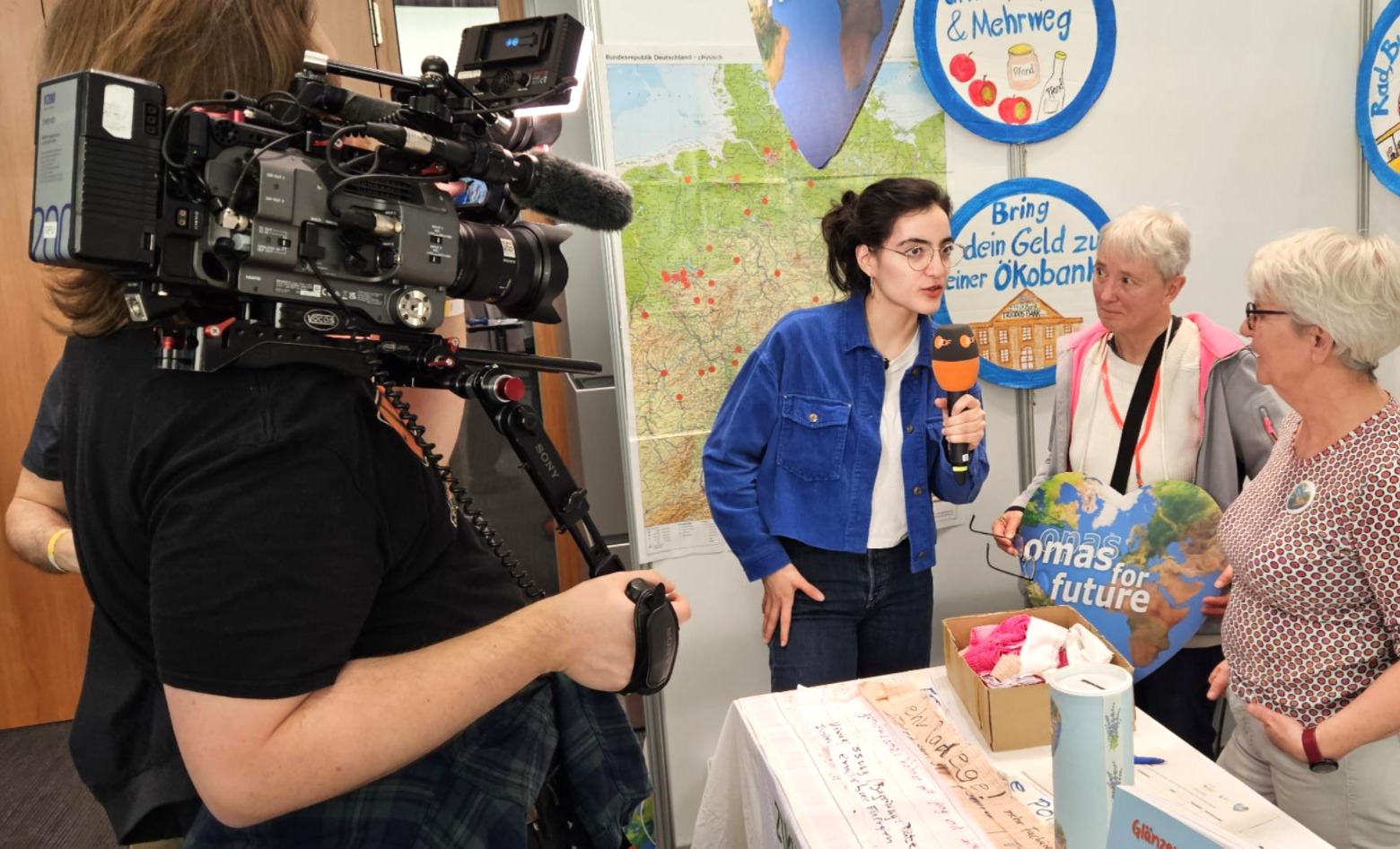 Am zweiten Tag stand die Podiumsdiskussion mit dem Leiter der Naturfreunde Deutschlands Michael Müller an, bei der ich die Omas repräsentieren durfte. Das Thema lautete „Demokratie und Klimaschutz“. Da Herr Müller leider auf Grund einer Zugverspätung nicht anwesend sein konnte, sprang seine Stellvertreterin Regina Schmidt-Kühner ein. Wir stellten unsere Organisationen vor, und in der anschließenden freien Diskussion mit Besucher*innen stellte sich Folgendes heraus: Viele Menschen fühlten sich hilflos und allein gelassen, den großen Lobby-organisationen schutzlos ausgeliefert, machtlos gegenüber der Klimakrise… Doch Regina und ich sprachen nach Kräften, Mut zu, bestärkten mit „ins Handeln zu kommen“, selber Hand anzulegen. Warum nicht beispielsweise aktiv in unseren Organisationen werden? Und so ging doch so manche gestärkter aus der Veranstaltung heraus, als sie gekommen waren. Ganz spontan bot Herr Hasbach von dem Verein Eure Welt an, einen kleinen Vortrag zu der Bedeutung des CO2-Fußabdrucks einzubringen – eine sehr gelungene Ergänzung!