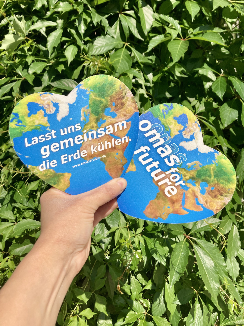 „Lasst uns gemeinsam die Erde kühlen.“ ist deshalb auf der einen Seite zu sehen, auf der anderen Seite das Omas for Future-Logo. Für den Wiedererkennungseffekt ist der Fächer natürlich in unserer bekannten Erdherzform gestaltet und passt dank seiner Größe in jede Hand- oder Fahrradtasche.