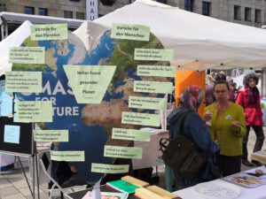 Unsere Infostände sind Mitmachstände, oft mit kleinen Bastelmöglichkeiten, Glücksrad, Beschriften von Klimabändern.